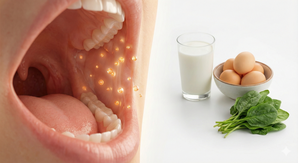 구내염은 입술 안쪽, 혀, 잇몸 등 구강 점막에 염증이 생기는 질환으로, 면역력이 저하되었을 때 가장 먼저 나타나는 신체 반응 중 하나입니다. 우리 몸의 점막 세포는 재생 주기가 매우 짧아 끊임없이 새로운 세포가 만들어져야 하는데, 이때 핵심적인 역할을 하는 영양소가 바로 **비타민 B2(리보플라빈)**입니다. 비타민 B2는 체내에서 에너지를 생성하는 대사 과정에 필수적인 조효소로 작용하며, 특히 세포의 재생을 돕고 점막을 튼튼하게 유지하는 방어막 역할을 수행합니다.