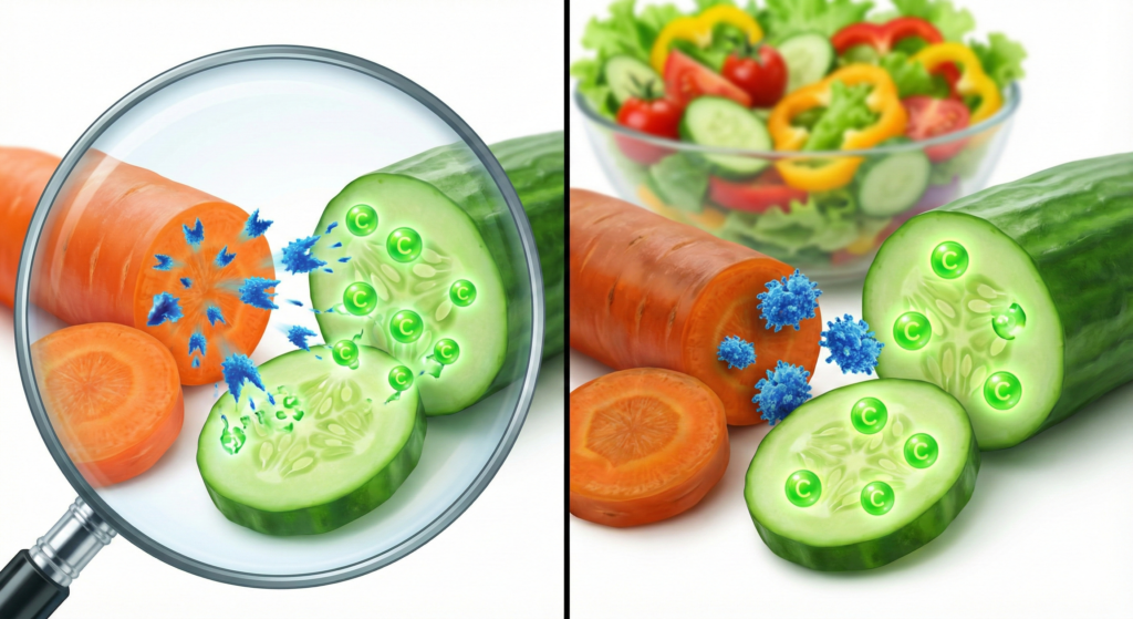 건강을 위해 챙겨 먹는 신선한 샐러드나 김밥 속에서 흔히 볼 수 있는 당근과 오이의 조합은 영양학적 관점에서 볼 때 반드시 피해야 할 ‘상극’의 조합입니다. 당근에 함유된 특정 성분이 오이의 핵심 영양소인 비타민 C를 철저하게 파괴하기 때문입니다. 이 글에서는 당근과 오이를 함께 조리했을 때 발생하는 생화학적 반응을 분석하고, 비타민 C 손실을 막기 위한 과학적인 조리 전략과 영양소 흡수를 극대화하는 올바른 배합법을 상세히 기술합니다.
