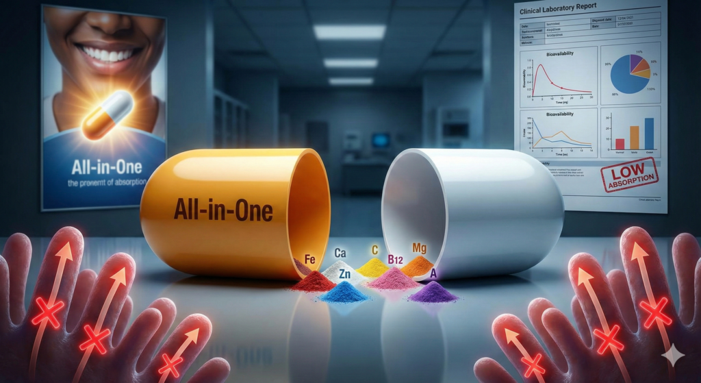 또한, 비타민 C는 비타민 B12의 흡수를 방해할 수 있으며, 지용성 비타민과 수용성 비타민이 한데 섞여 있는 구조는 각각의 성분이 최적으로 흡수될 수 있는 환경(공복 혹은 식후)을 제공하지 못합니다. 멀티 비타민 제조사들은 이러한 화학적 상충 관계를 무시한 채 단순히 많은 성분을 넣는 데만 급급한 경우가 많습니다. 결과적으로 수십 가지 성분을 먹더라도 우리 몸이 실제로 받아들이는 영양소는 극히 일부에 불과하며, 나머지 성분은 소화 과정에서 충돌을 일으켜 장내 불편감이나 메스꺼움만을 유발하게 됩니다.