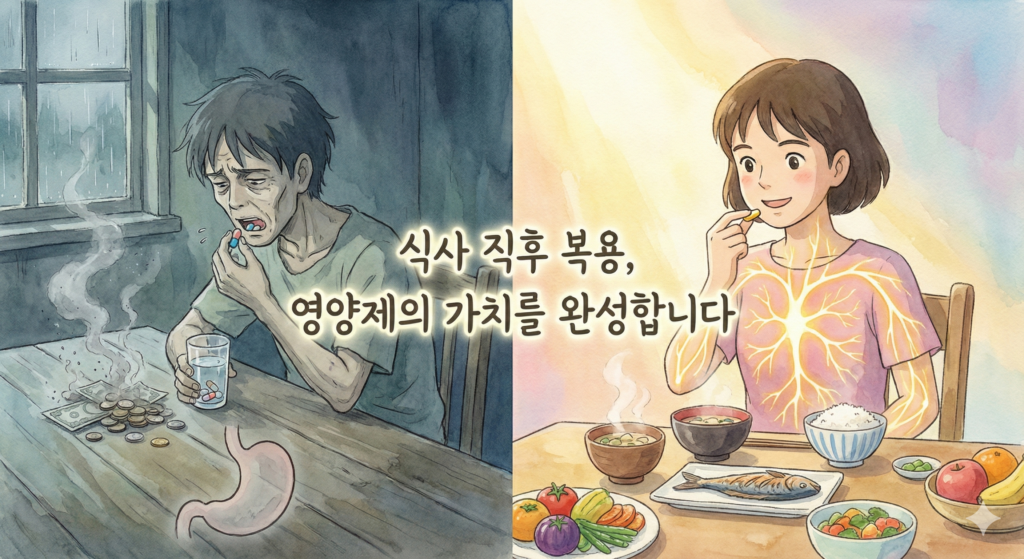 또한 위산이 과다하게 분비된 상태에서 음식물 없이 영양제만 투입되면, 위장 운동의 불균형으로 인해 식도 역류 증상이 악화될 수 있습니다. 비타민 E나 오메가-3와 같은 지용성 성분은 공복 섭취 시 특유의 비린 향이 역류하는 ‘트림 현상’을 유발하여 복용 순응도를 떨어뜨립니다. 음식물과 섞여 자연스럽게 소화 경로를 따라 내려갈 때 위장관의 자극을 최소화하고 혈중 농도를 완만하게 올릴 수 있음을 명심해야 합니다.