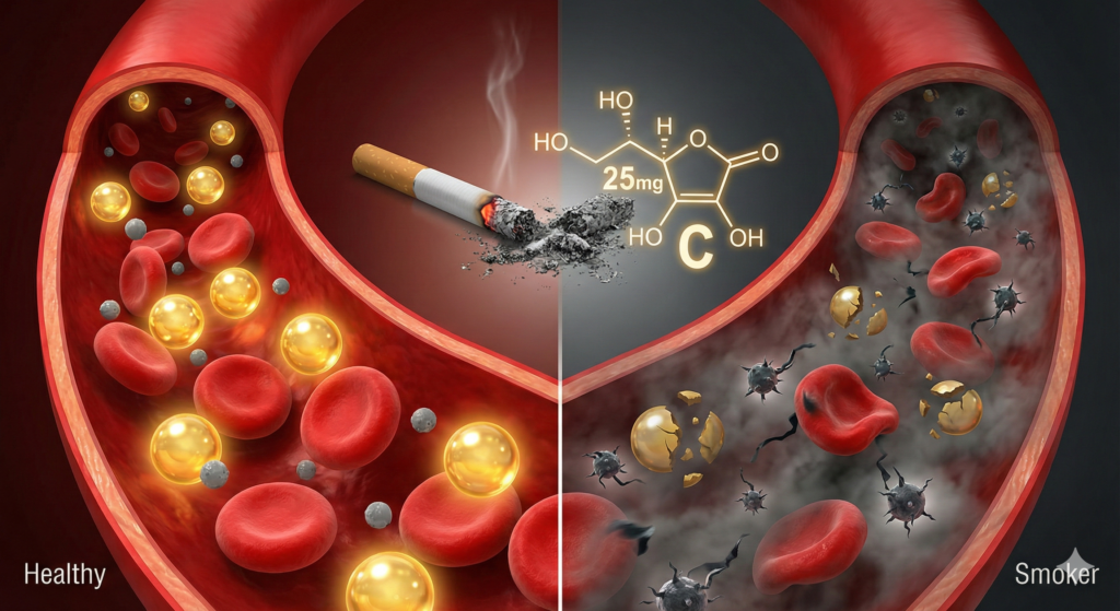 담배 연기에는 수천 가지의 유해 물질과 활성산소(Free Radicals)가 포함되어 있습니다. 담배를 한 모금 들이마시는 순간, 우리 몸은 유입된 독성 물질을 중화하기 위해 체내의 항산화 시스템을 풀가동합니다. 이때 가장 먼저 소비되는 핵심 자원이 바로 **비타민 C(아스코르브산)**입니다. 비타민 C는 활성산소에 전자를 내주어 독성을 중화하는 역할을 하는데, 흡연자는 끊임없이 독소를 유입시키기 때문에 비타민 C가 저장될 틈 없이 실시간으로 소모됩니다.